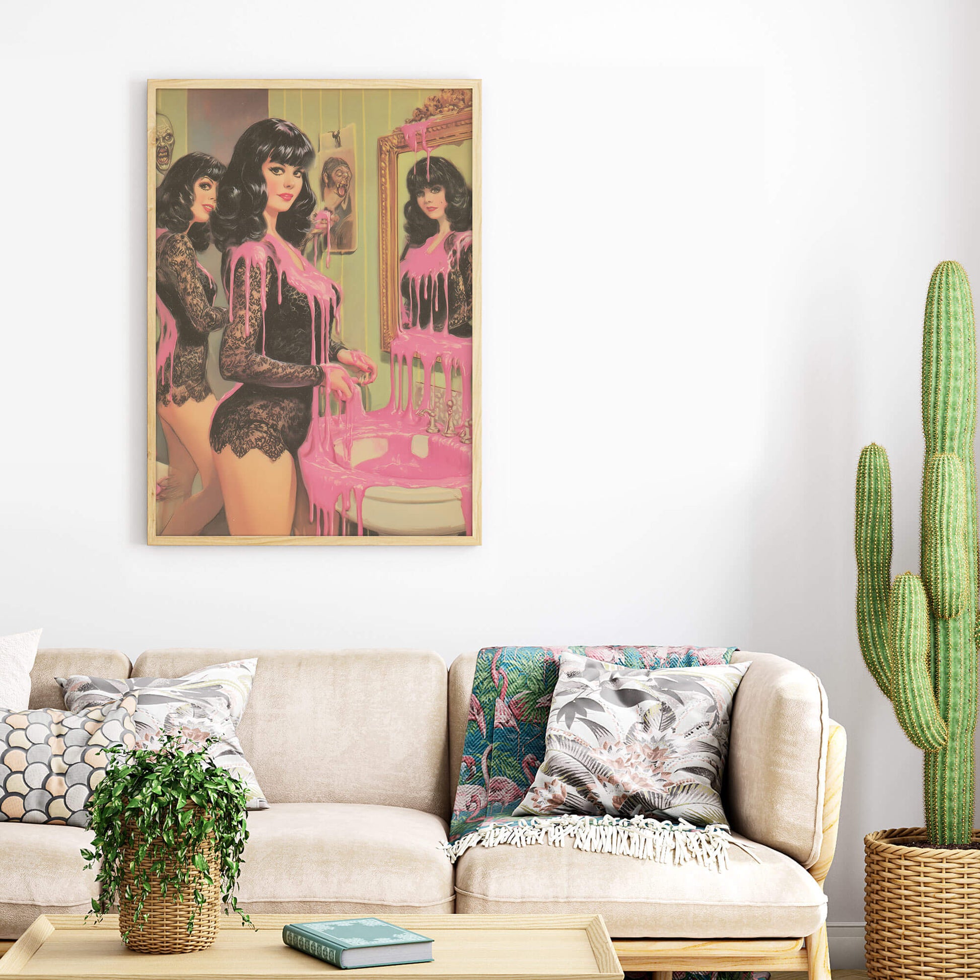 Welcome to “Bubblegum Bloodbath”, where sweetness curdles and glamour drips straight into chaos. This striking piece of erotic art blends vintage pin-up allure with gothic art sensibilities, featuring a sultry muse surrounded by melting pink goo that looks equal parts candy-coated and criminal. Lace, lipstick, and latex tones collide in a bathroom scene that feels like a crime scene designed by a bombshell.