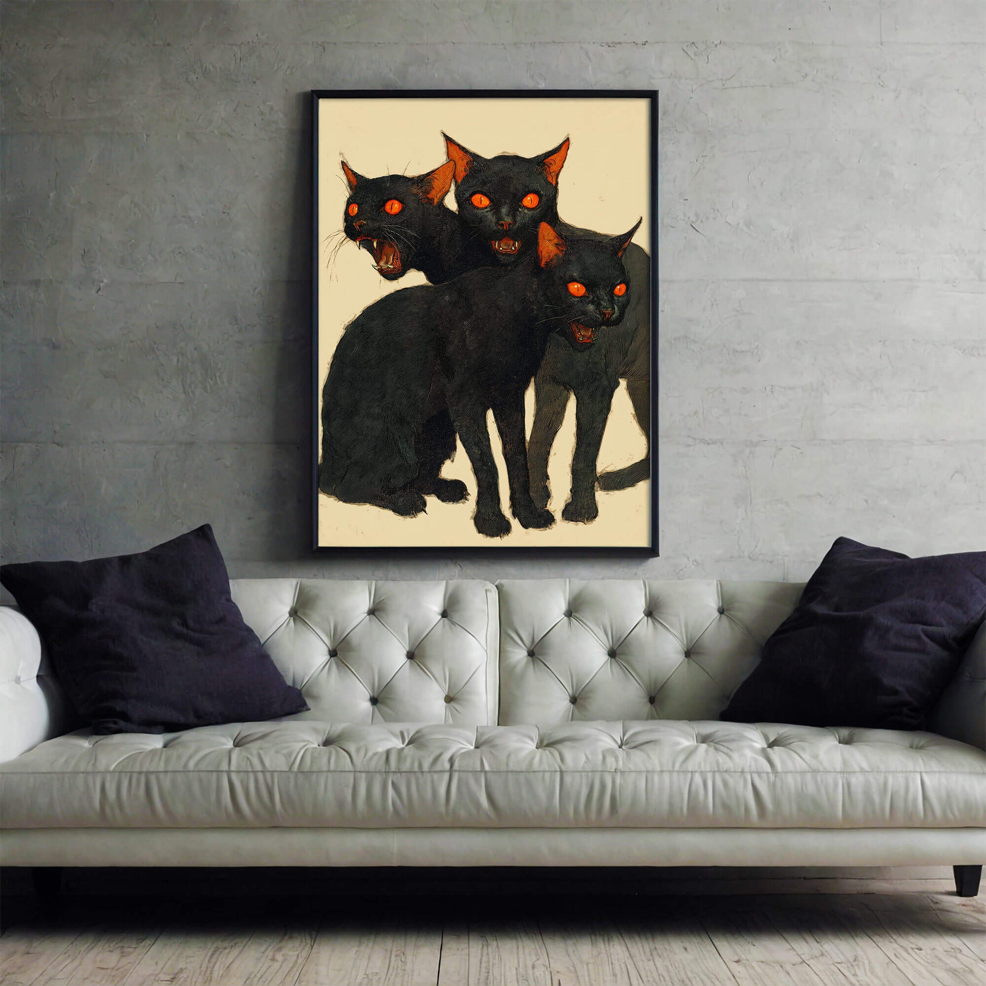 Justice wears whiskers in "Claw & Order", a surreal vintage halloween cat poster that prowls between camp and chaos. These three felines, with eyes blazing like jack-o’-lanterns, aren’t here to chase mice—they're here to prosecute your soul. Rendered in a lurid retro style, this artwork feels ripped straight from a drive-in horror flick where every hiss is a death sentence. Perfect for collectors of macabre wall art, retro Halloween fans, or anyone who thinks “good cop, bad cop” works better with claws.