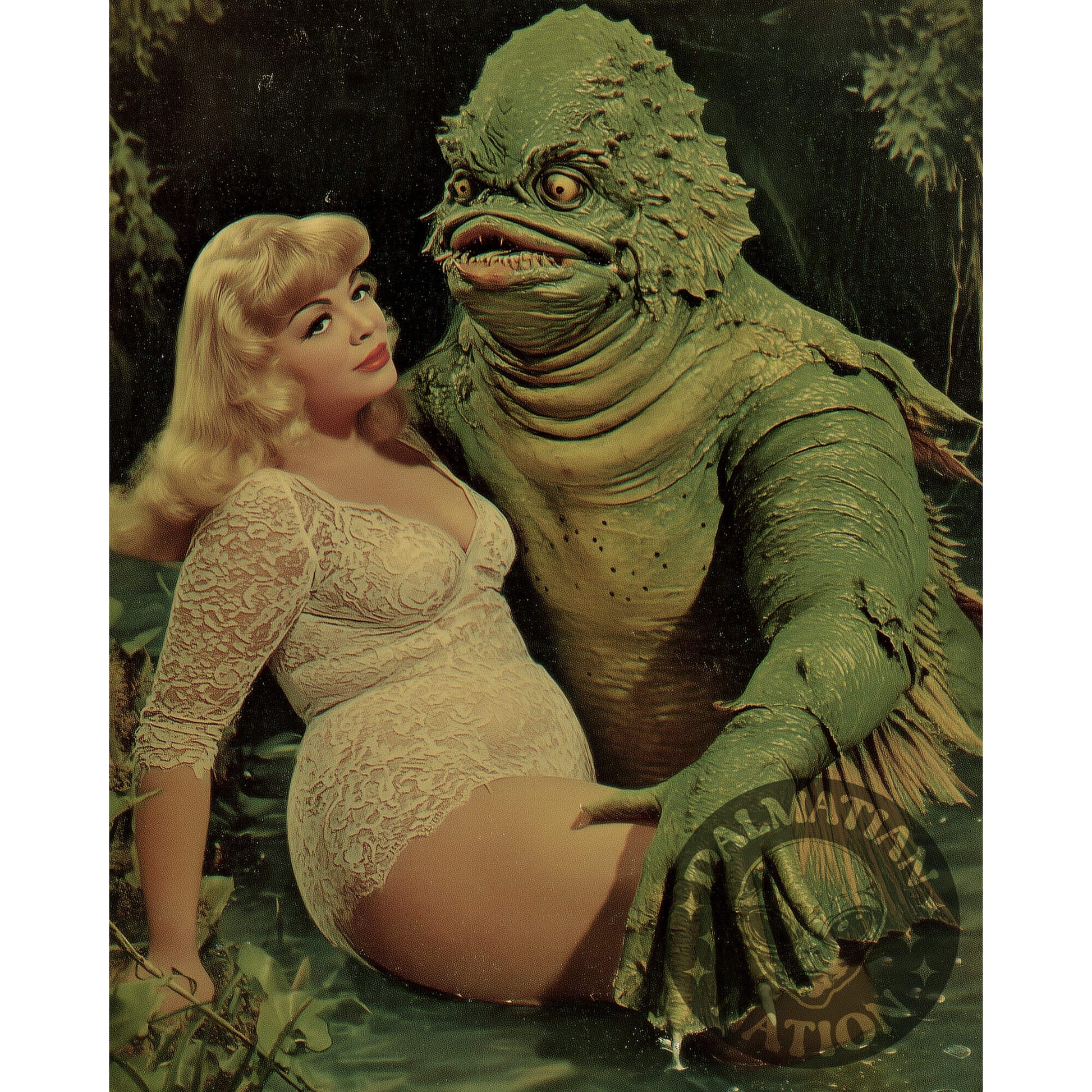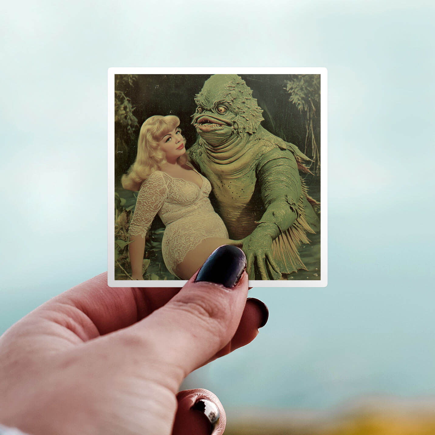 Stick a little swampy romance wherever you please. "Cuddlefish" brings a swamp monster and his glamorous pin-up sweetheart to your laptop, water bottle, or notebook, tangled in a campy embrace that’s equal parts slime and sparkle. Perfect for fans of retro horror stickers, kitschy monster art, and anyone who loves their romance sticky and strange