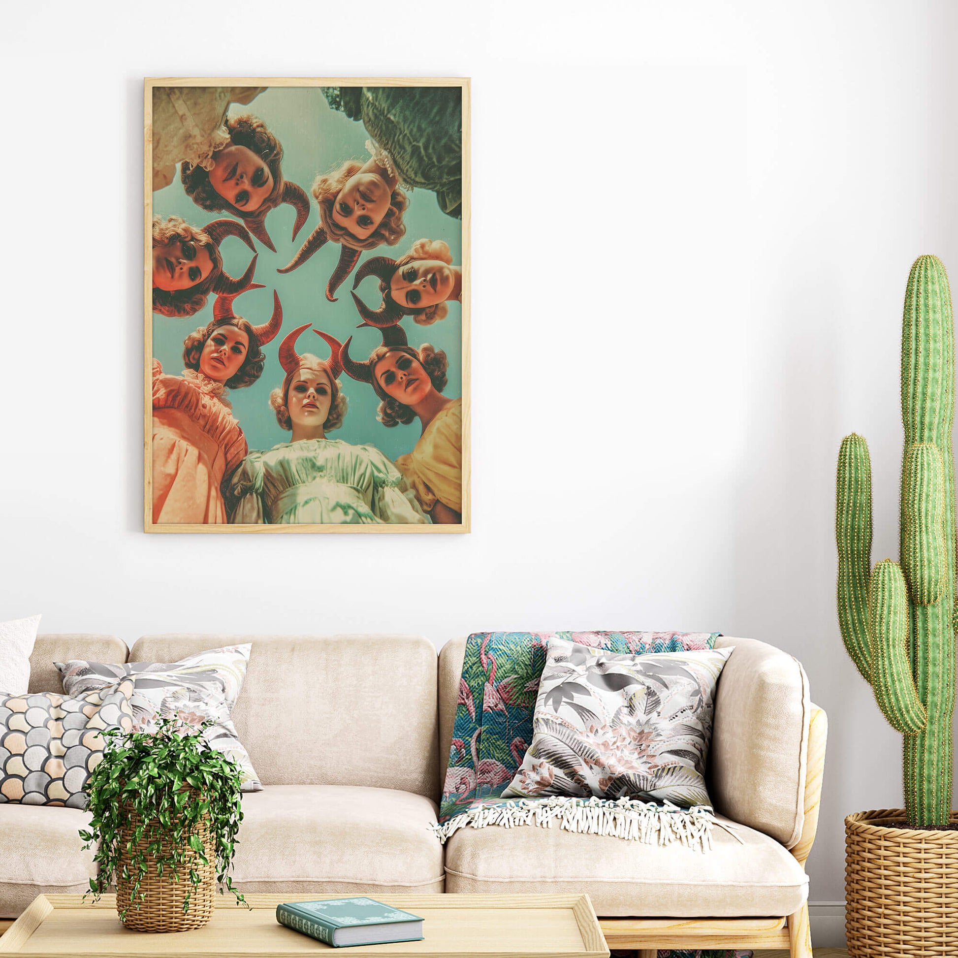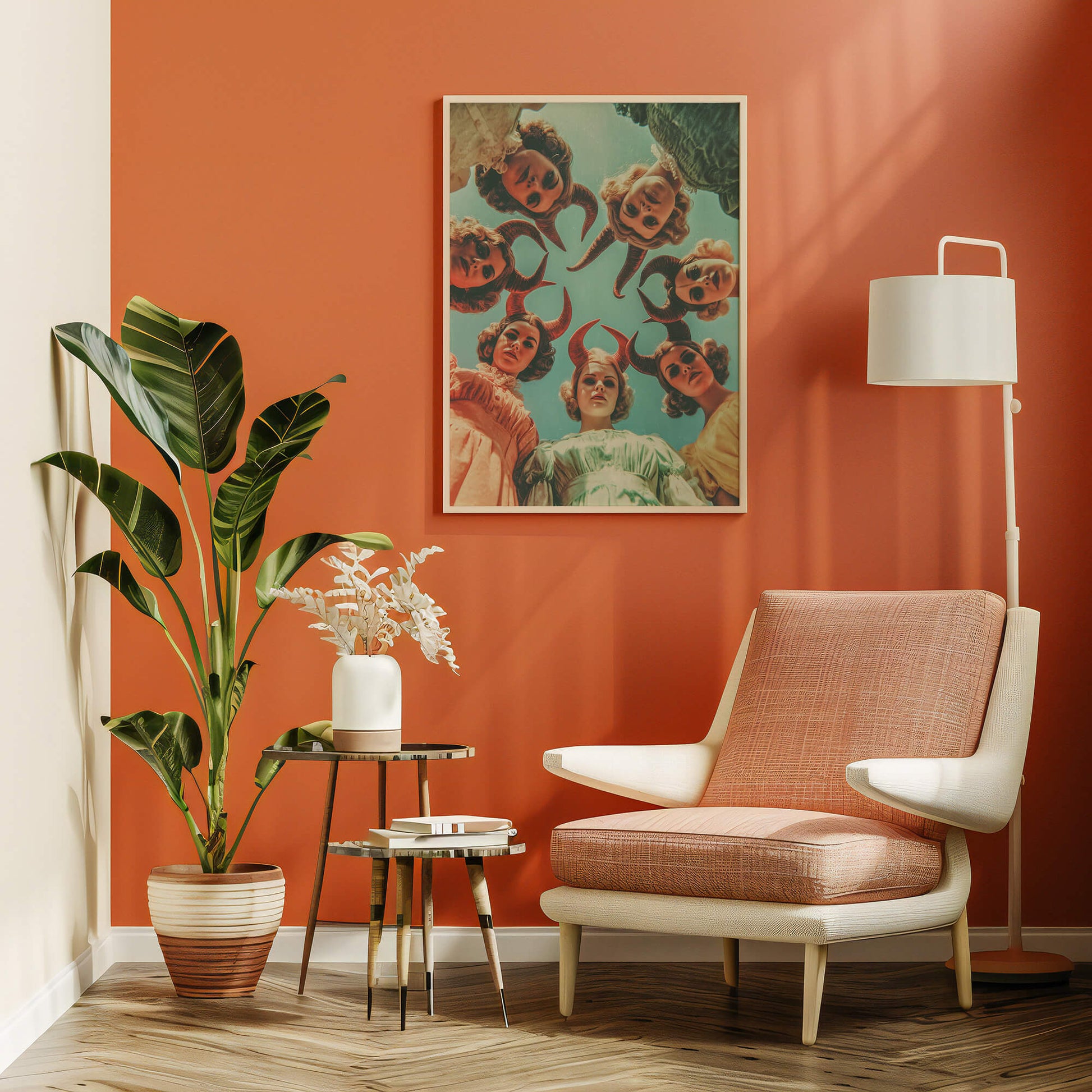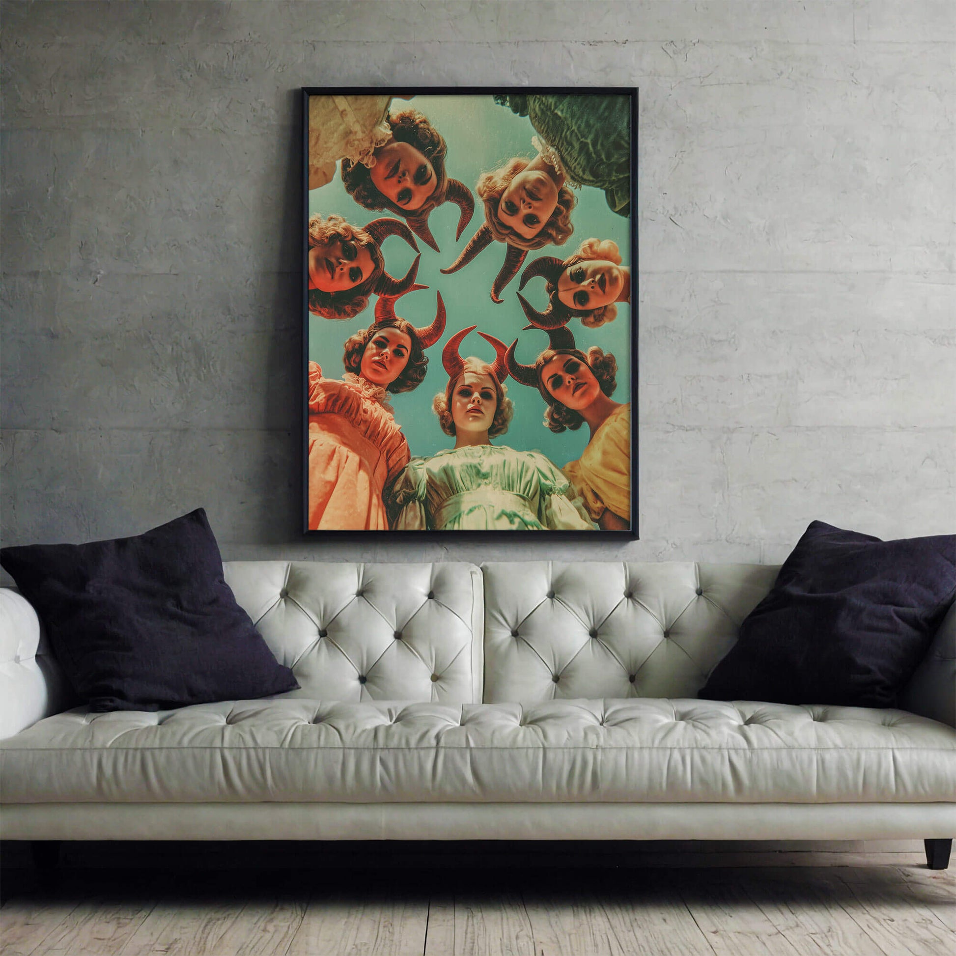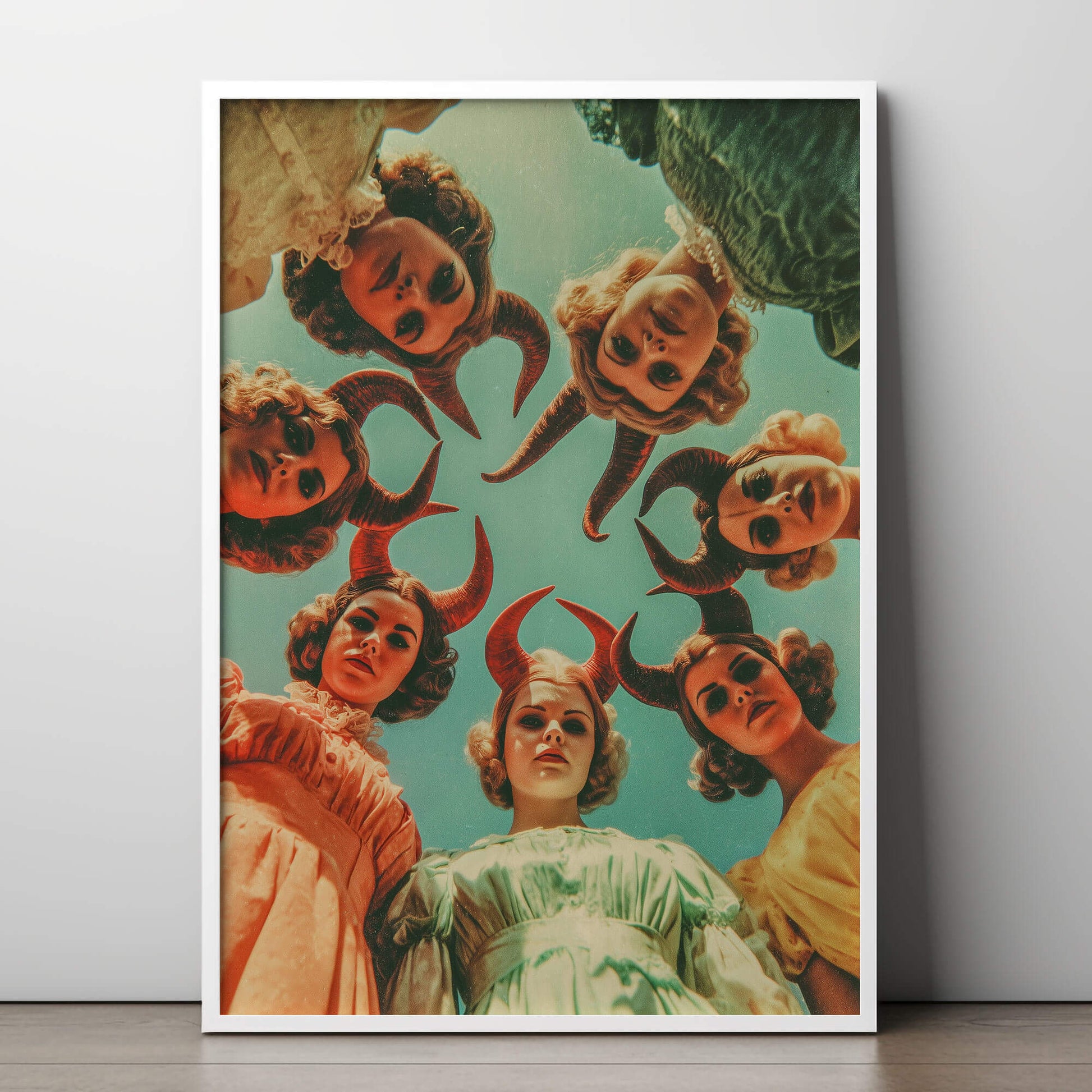 Ever wondered what the PTA meeting in purgatory looks like? Our "Horny Housewives of Hell" poster gives you a darkly humorous peek behind the veil! This unique AI artwork gathers a collection of perfectly coiffed, vintage-style ladies, each sporting a set of rather... distinguished horns. With expressions that say "I'd like to speak to your manager (of souls)," they're ready to judge your life choices and maybe, just maybe, drag you to the underworld for brunch.