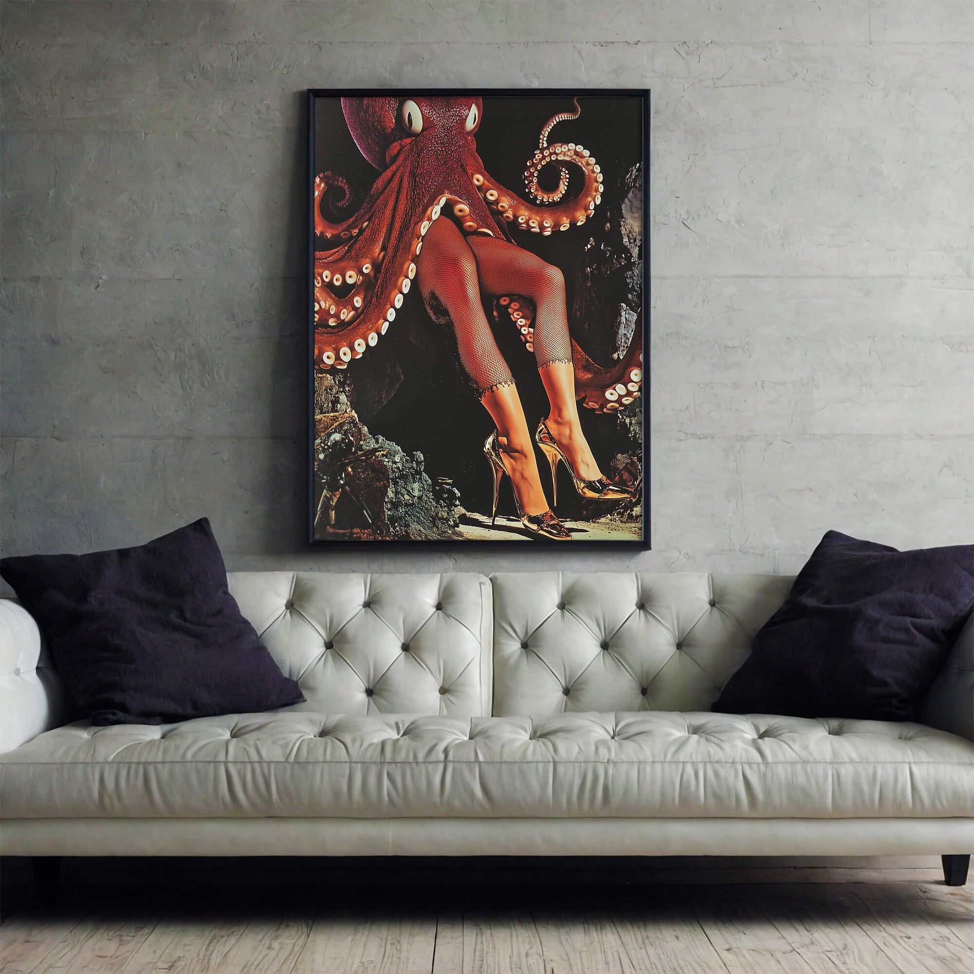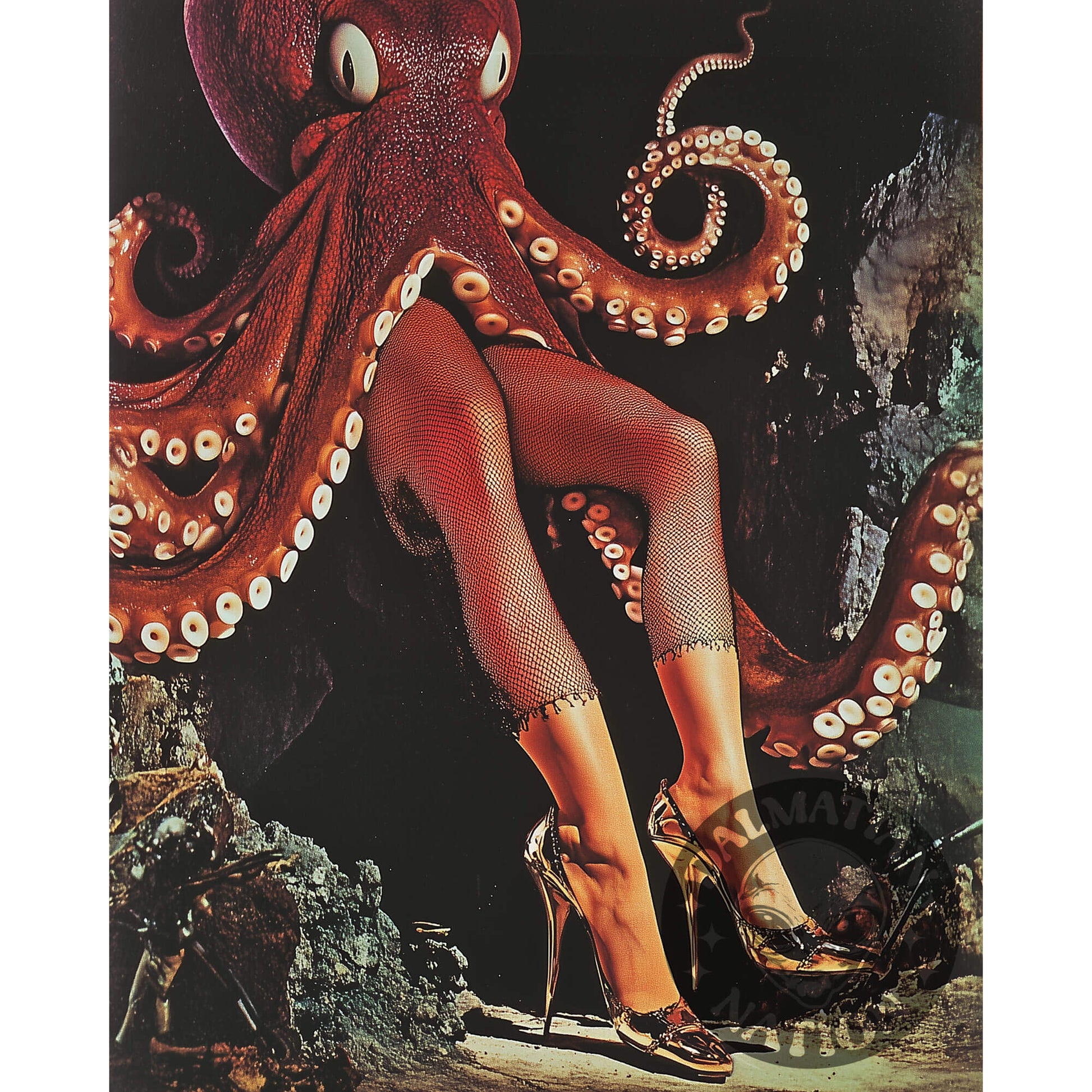 When the abyss calls, make sure to wear heels. This octopus is no ordinary sea creature—it’s a fashion-forward nightmare with fishnet stockings and gleaming gold stilettos. Tentacles swirl ominously, but the real star is the pair of glamorous legs sticking out from its body. A surreal blend of vintage horror and macabre artwork, this quirky wall poster is a bold statement piece for those who embrace the bizarre with a dash of fabulous.