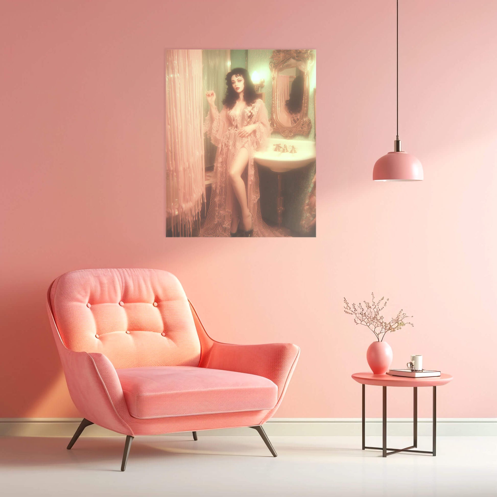Sweet on the surface, sinister underneath—“Pretty in Pepto” is a pastel nightmare you’ll want on your wall. This gothic art poster captures a vintage pin-up moment soaked in pink haze, sheer lace, and bad intentions. The scene feels intimate, decadent, and just a little wrong, like a haunted dollhouse for grown-ups.