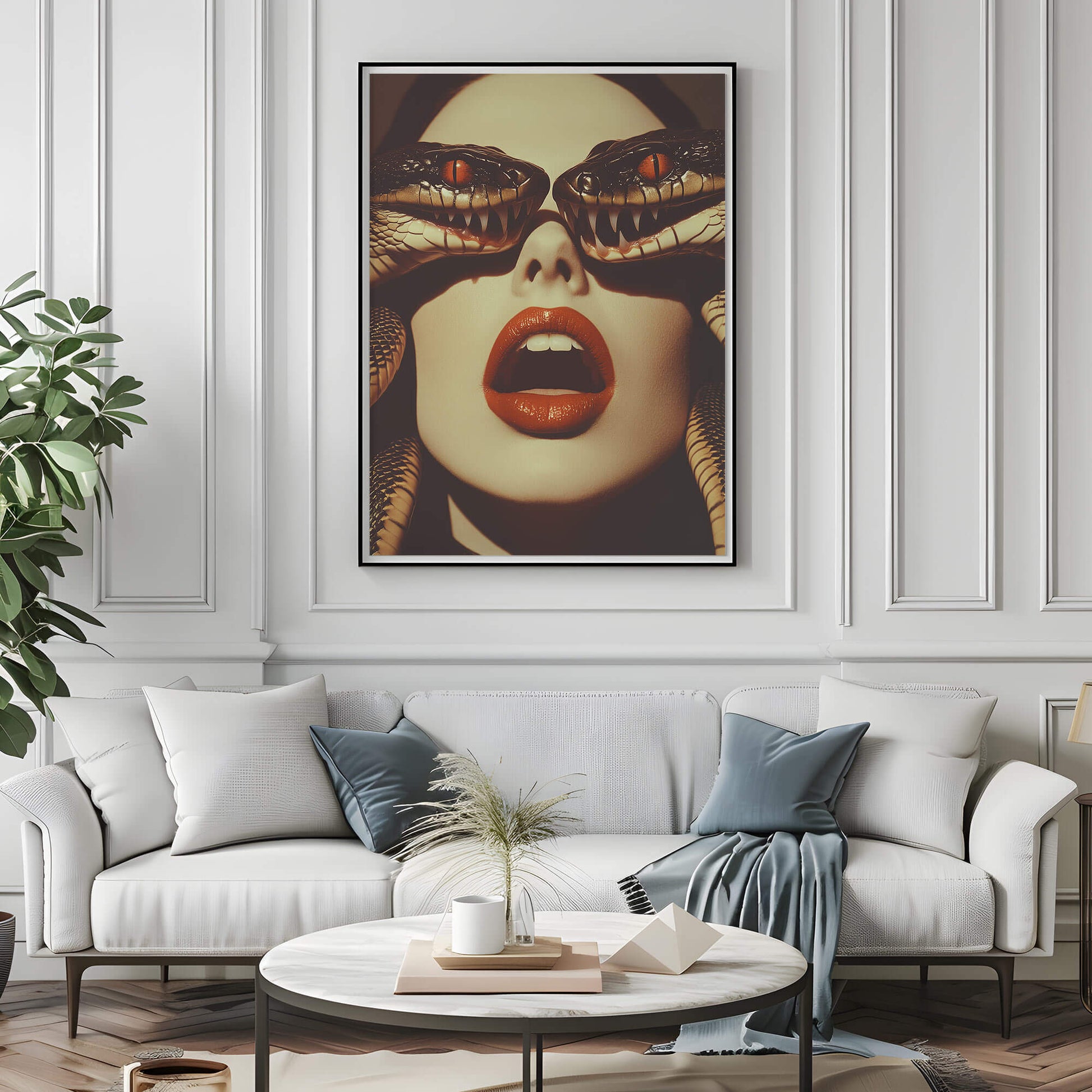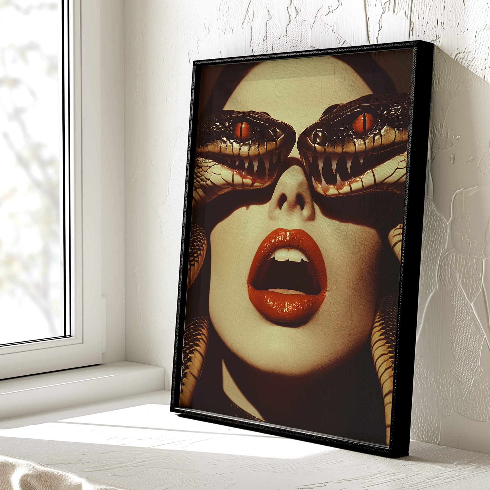 Whether you’re into dark aesthetics, surreal vibes, or just love snakes, this artwork will transform your space. This A.I. generated piece captures a moment of tension and beauty as a mysterious woman gazes through two fearsome snakes coiled around her face. Their gleaming eyes and sharp fangs exude a sense of raw power, while her parted lips add a sultry, hypnotic vibe.