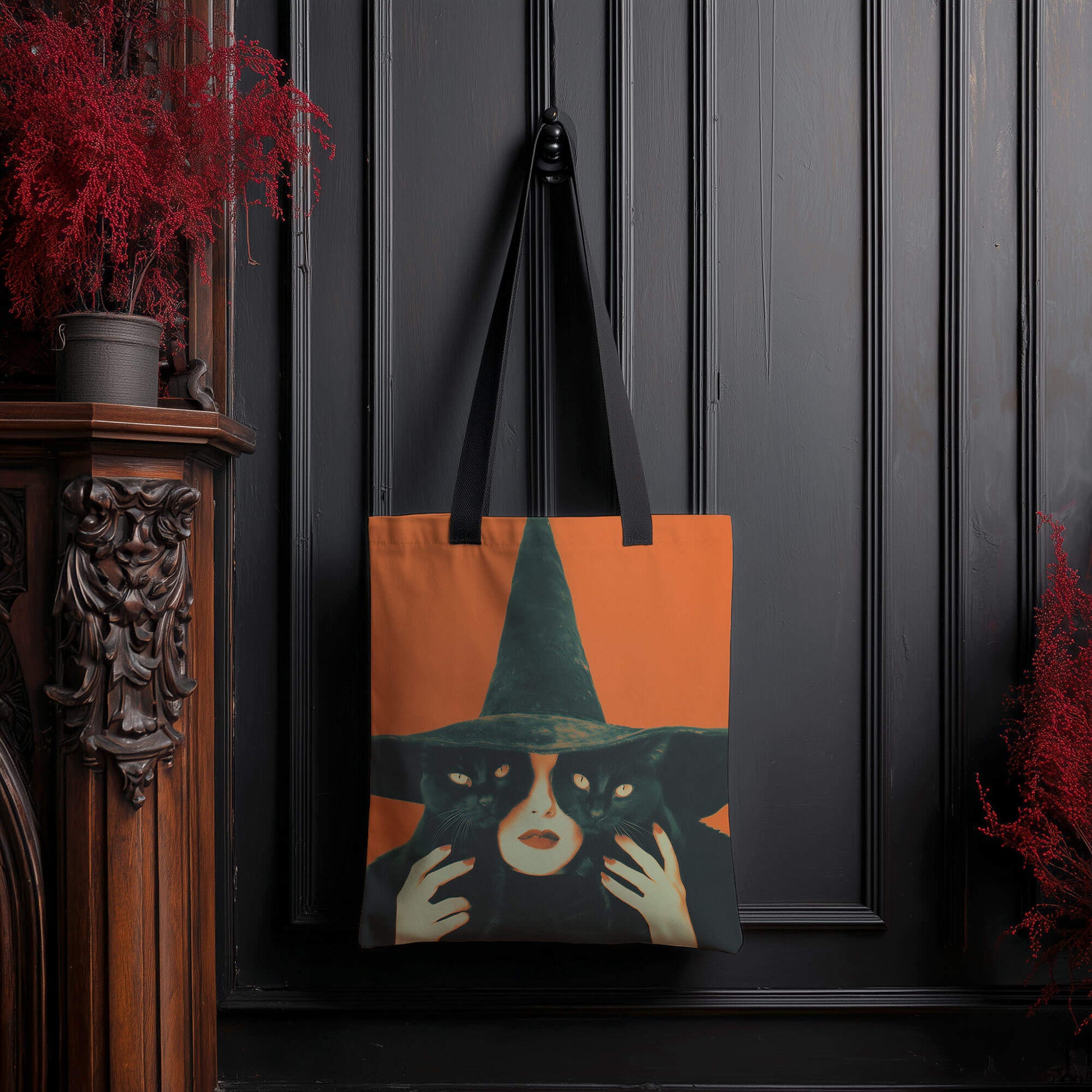 Some people have resting witch face — she carries it everywhere. The "Resting Witch Face" tote bag features a vintage-style Halloween design of a sultry sorceress flanked by her two black cats, each oozing judgment and charm. With bold red lips and an expression that says “I hex on the first offense,” this gothic tote is the perfect mix of camp, chic, and creepy. Ideal for spooky season errands, witchy conventions, or just carrying your potions (or groceries) in style.