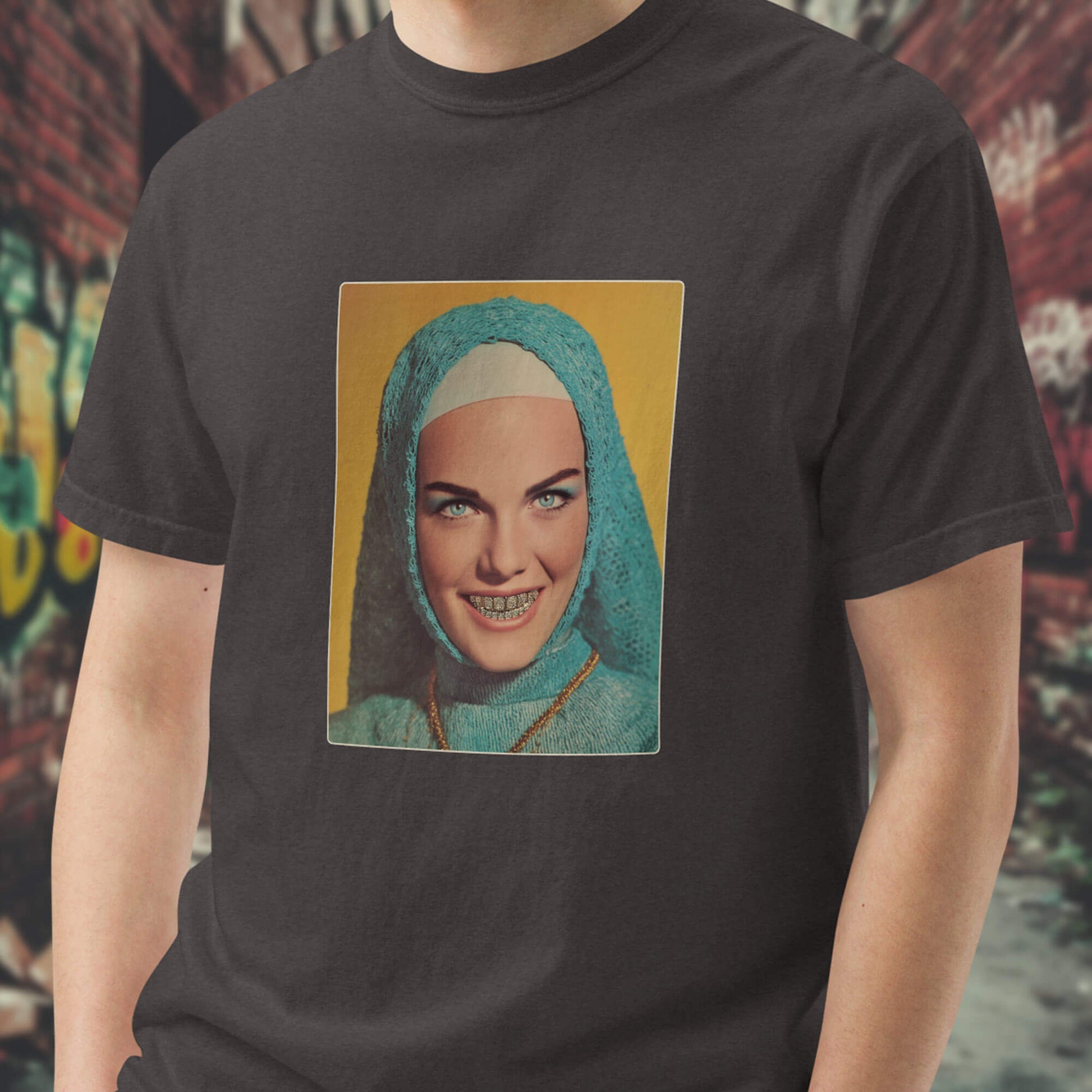 The locals whisper that she took a vow of silence just to make her smirk louder. Framed in mustard yellow like a saintly mugshot, "Sister From Another Mister" isn’t just a t-shirt—it’s a wearable legend. For those who like their faith a little freaky, their icons a little ironic, and their wardrobe baptized in blasphemy.