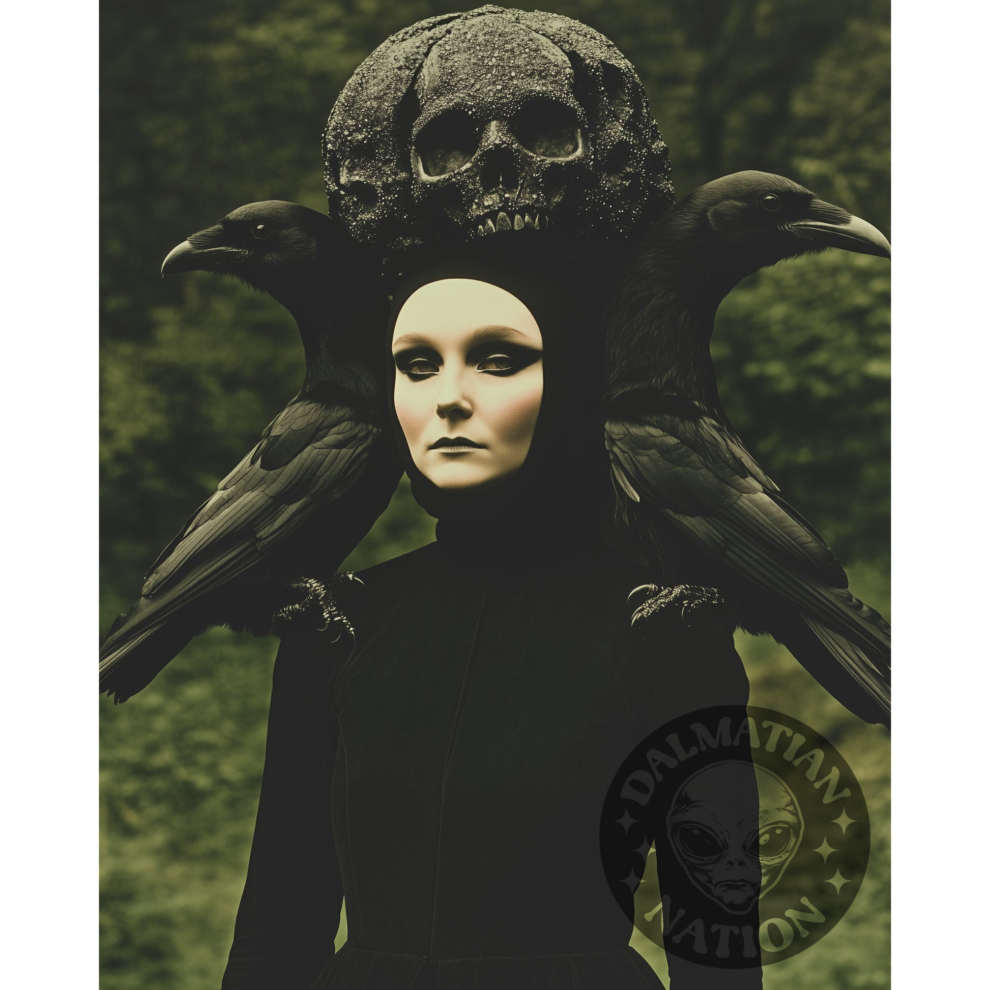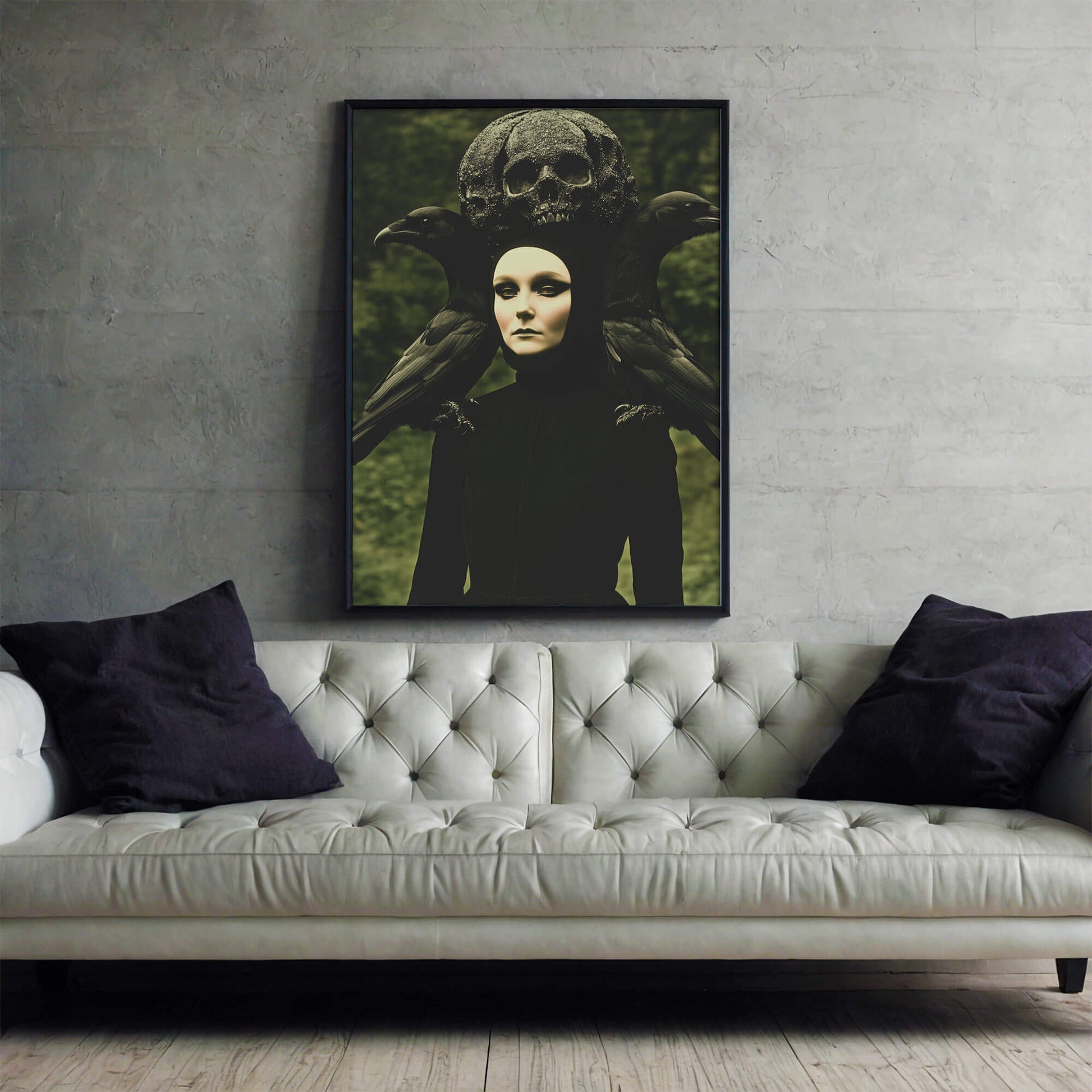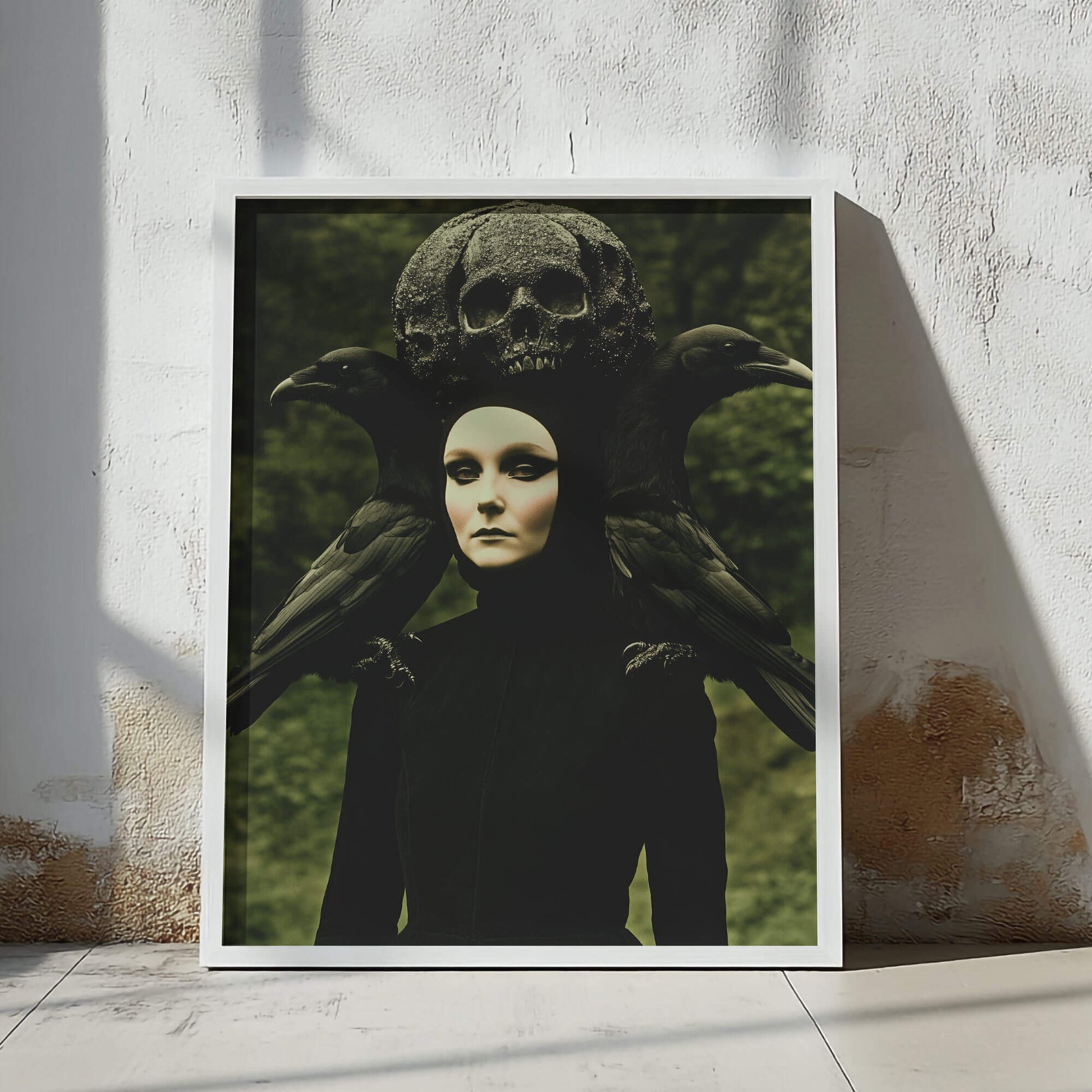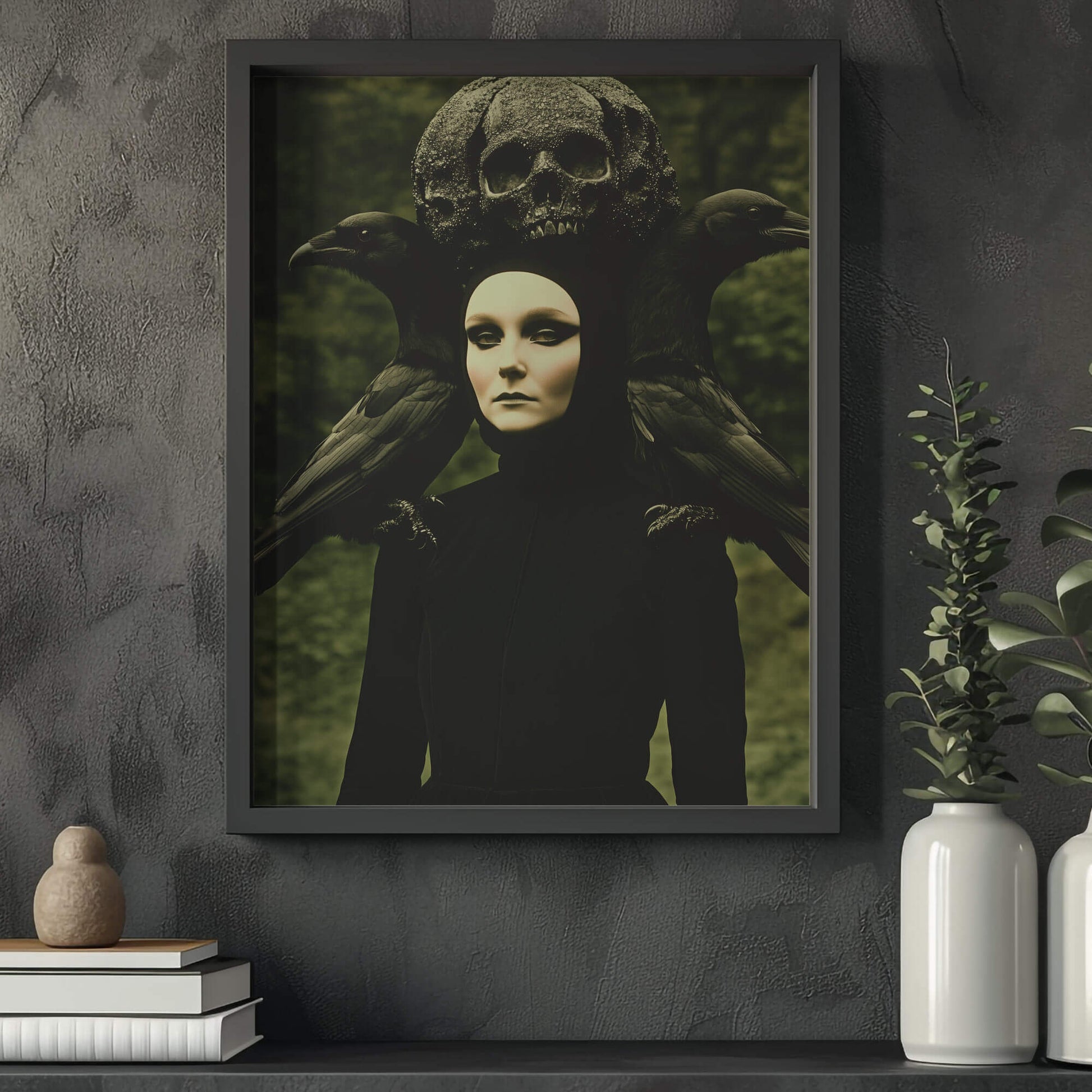 In the stillness of her gaze, there’s a quiet power—a whisper from the abyss. Draped in black, her skull-adorned headdress is a crown of the macabre, while twin ravens perch on her shoulders as if they’re messengers of secrets too dark for daylight. Her face is serene, but the energy around her speaks of eerie authority, as though she commands the shadows themselves. Is she a queen of the underworld, a keeper of lost souls, or merely a woman unbothered by the chaos of mortality? Either way, this hauntingly beautiful vintage-style poster invites you into her dark domain. Perfect for lovers of gothic decor, this piece will keep guests guessing—and maybe just a little uneasy.