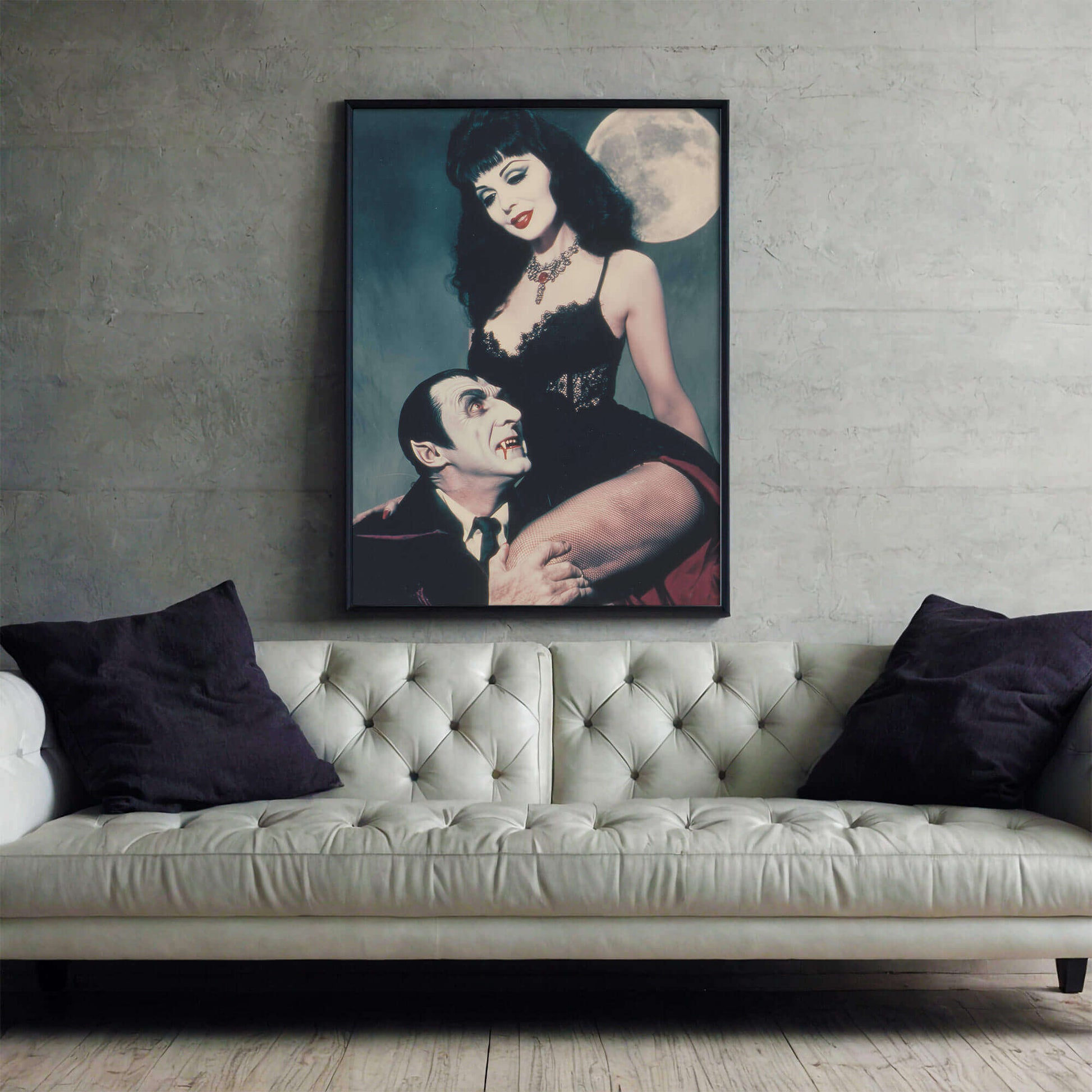Step into the moonlight with Vampire Kisses, a gothic pulp art poster where seduction sharpens its fangs. A pale count kneels in devotion, his hunger caught somewhere between romance and ruin, while his raven-haired temptress sits above him draped in lace and power. In a deliciously vintage horror style, this piece blends camp, kitsch, and dark allure into one blood-soaked fantasy. Perfect for gothic décor, cult horror collectors, or anyone who likes their love stories with a side of bite.