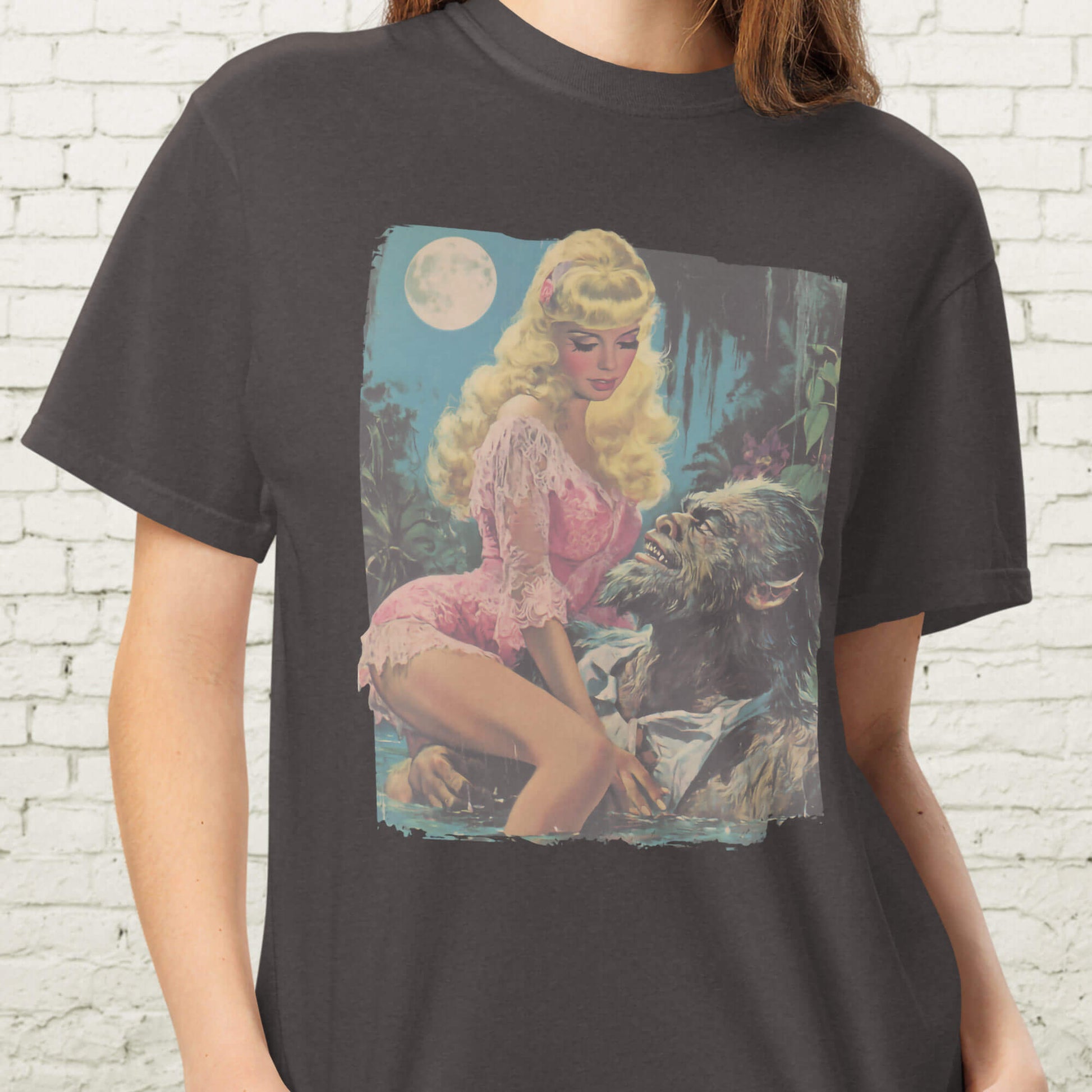 Dress for disaster with our "When Hairy Met Sally" werewolf shirt — a satirical spin on gothic romance where the leading man sheds more fur than charm. Printed in lurid retro detail, this t-shirt is an ode to monster dating gone horribly right. Ideal for horror fans, camp collectors, or anyone who laughs at the thought of bringing a werewolf home to mom.